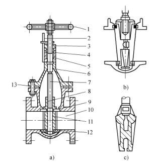 2) Concealed stem wedge gate valve: As shown in Figure 2, the sealing surface of this valve is inclined and forms an Angle. The higher the medium temperature, the larger the Angle. Wedge gate plates are classified into single gate plates, double gate plates and elastic gate plates, as shown in Figures 2a, b and c respectively. The processing, grinding and maintenance of wedge gate plates are more complicated than those of parallel gate plates, but they have better sealing performance.